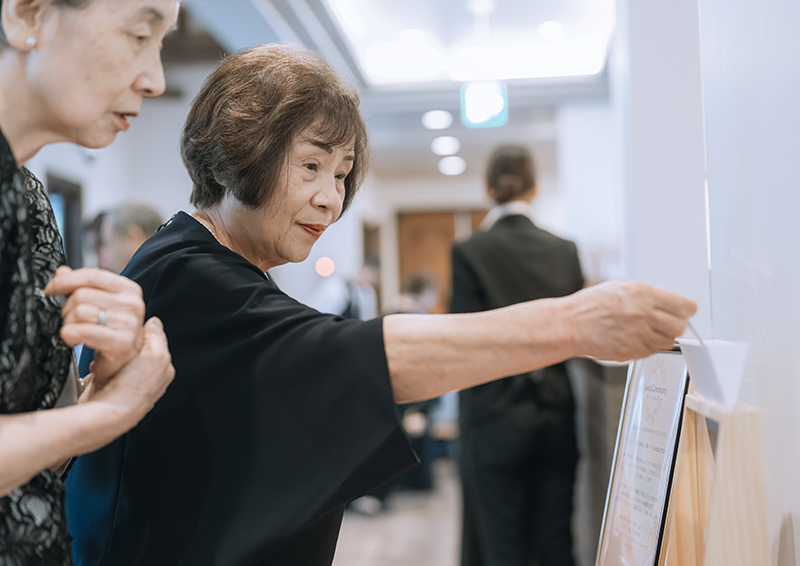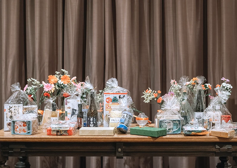 花束と一緒に手渡されたのは、お二人が心を込めて手作りした常滑焼の茶わんです。世界にひとつだけの記念品をお贈りすると、会場内は優しい拍手とお祝いの幸せな空気に包まれました。