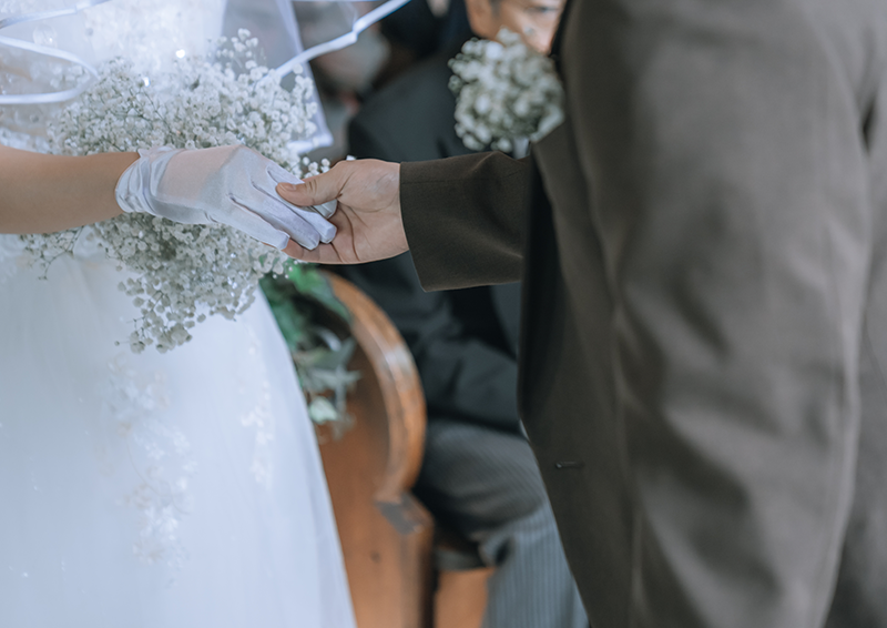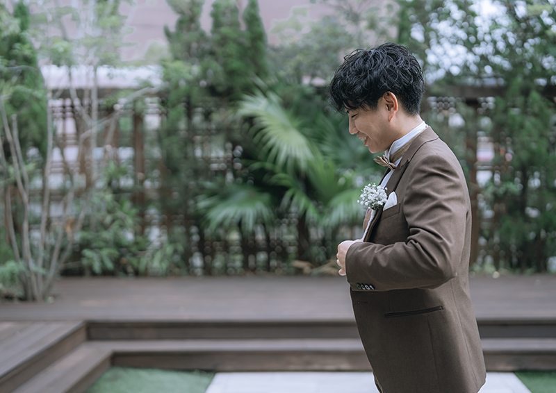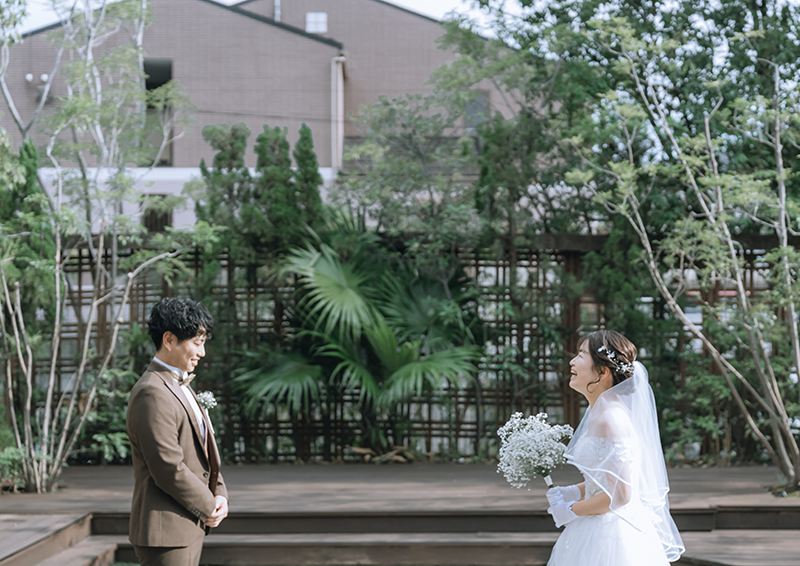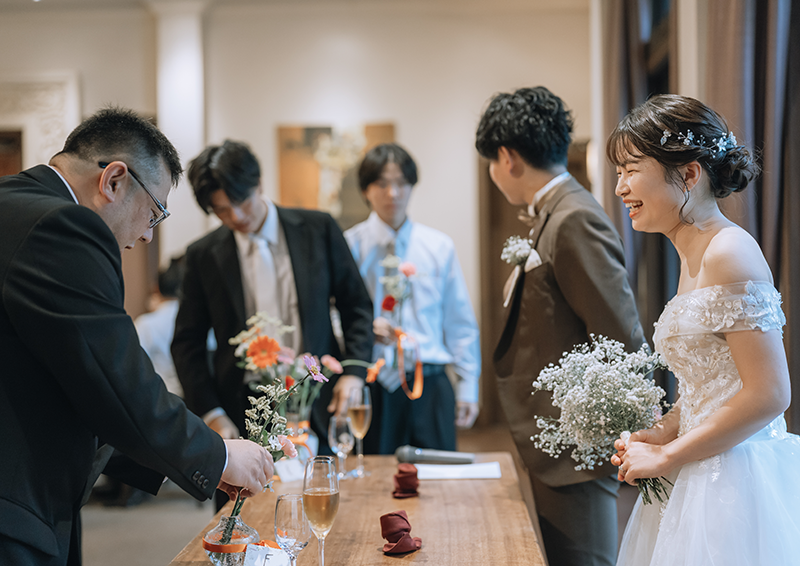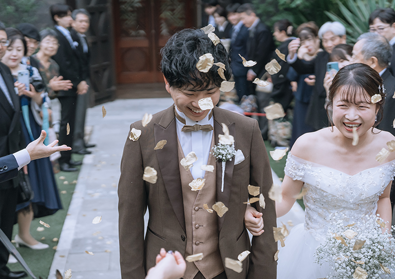 やわらかな空気の中、フラワーシャワーに包まれるふたり。先ほどまでの緊張がほどけ、自然と笑顔が広がっていきます。
