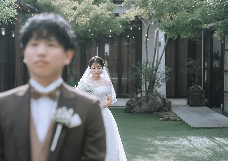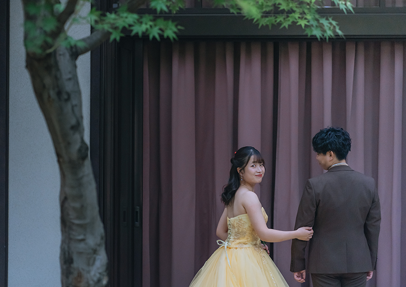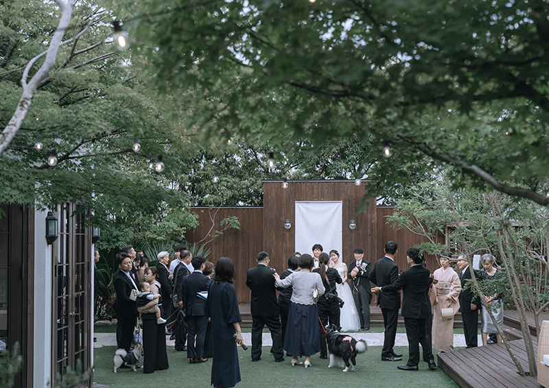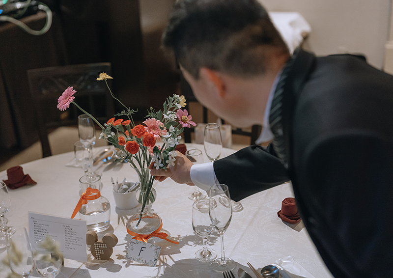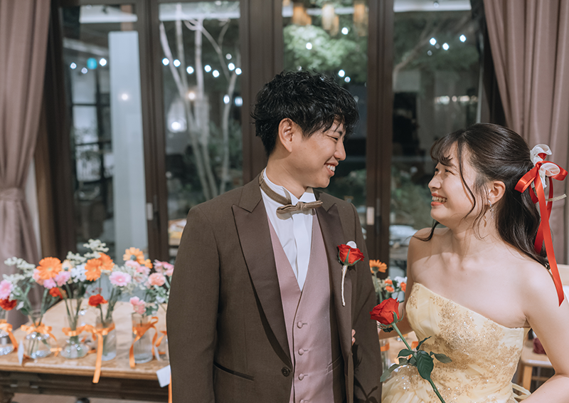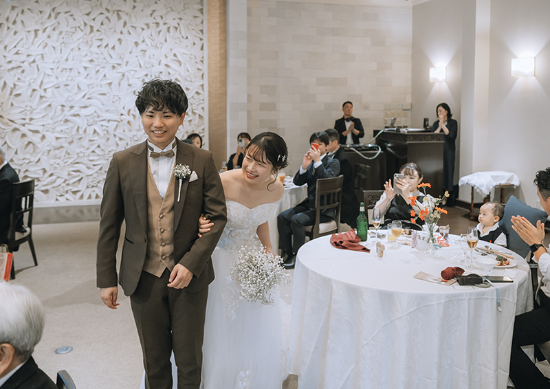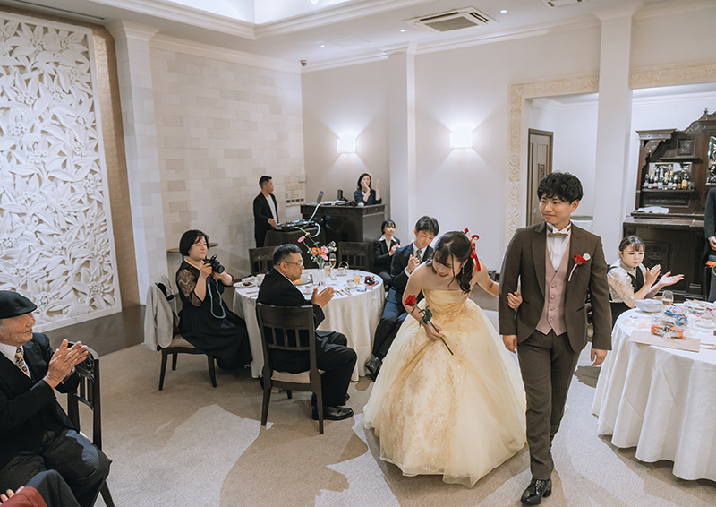 お色直しを終えたお二人は、ガーデンから華やかに再入場 。各テーブルを回り、ご挨拶を兼ねたテーブルフォトでゲストお一人おひとりへ感謝を伝えられました 。