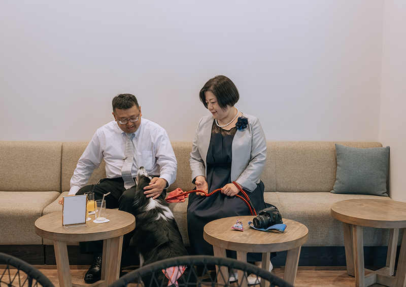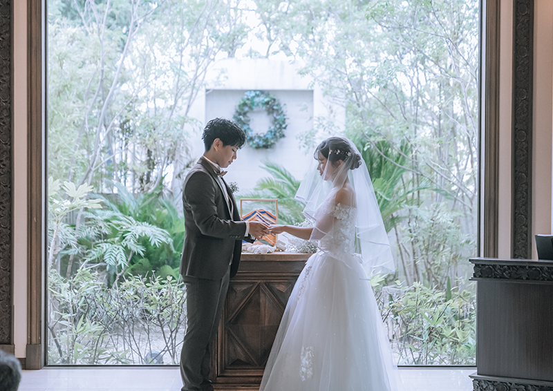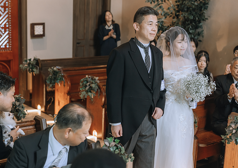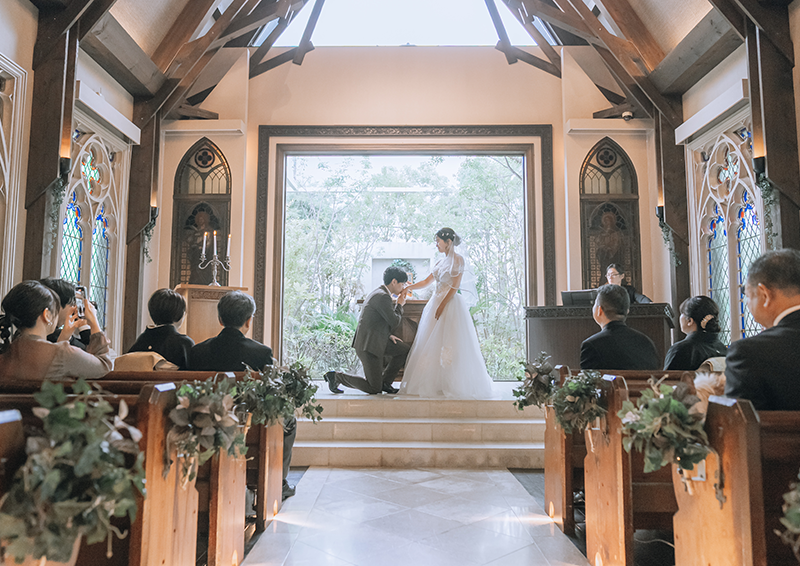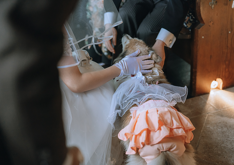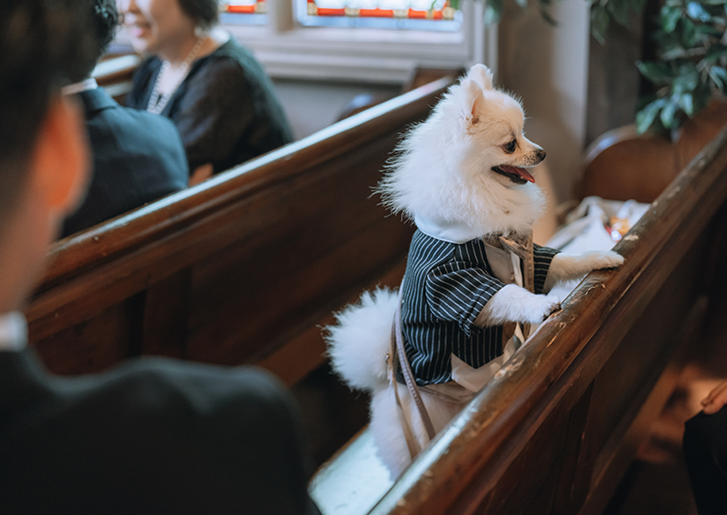 一番の見どころは、リングドッグを務めたワンちゃんたち。 一生懸命に指輪を運ぶ二匹の姿に、チャペル内は温かな拍手に包まれました。