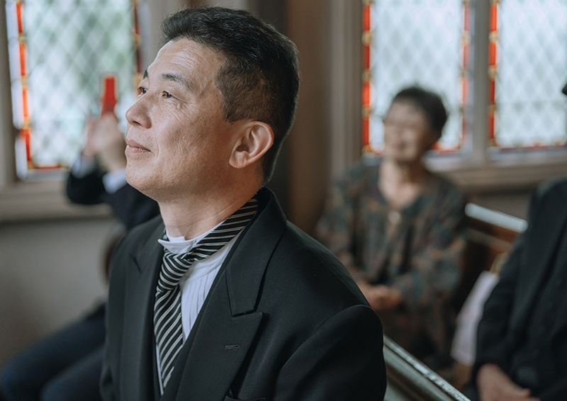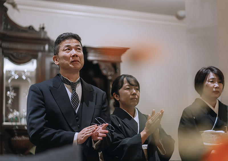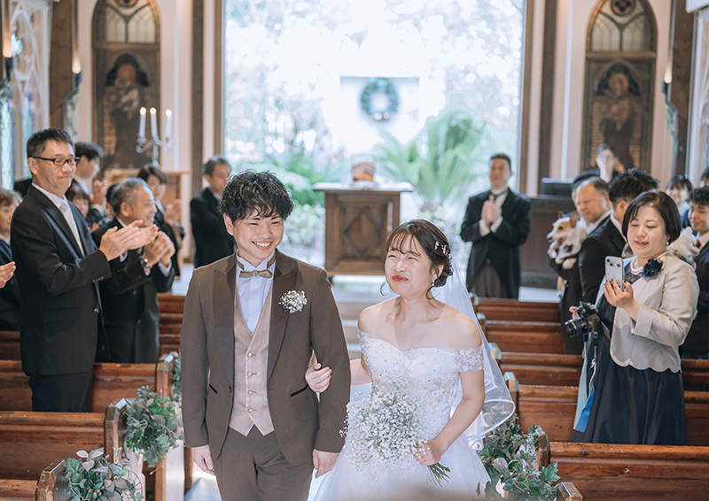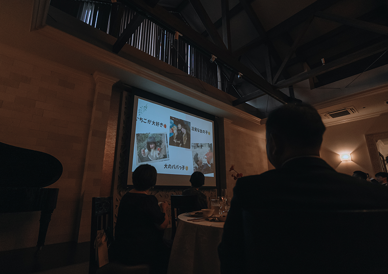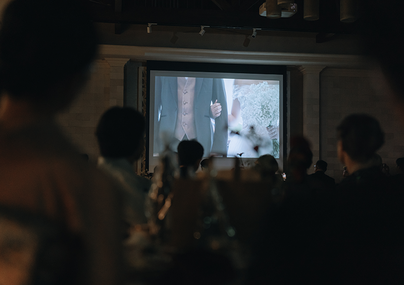 ご両家代表と新郎様からのご挨拶のあと、お二人は温かな拍手に送られて退場。最後に、エンドロールが上映され、感動の余韻とともに式は結びとなりました。