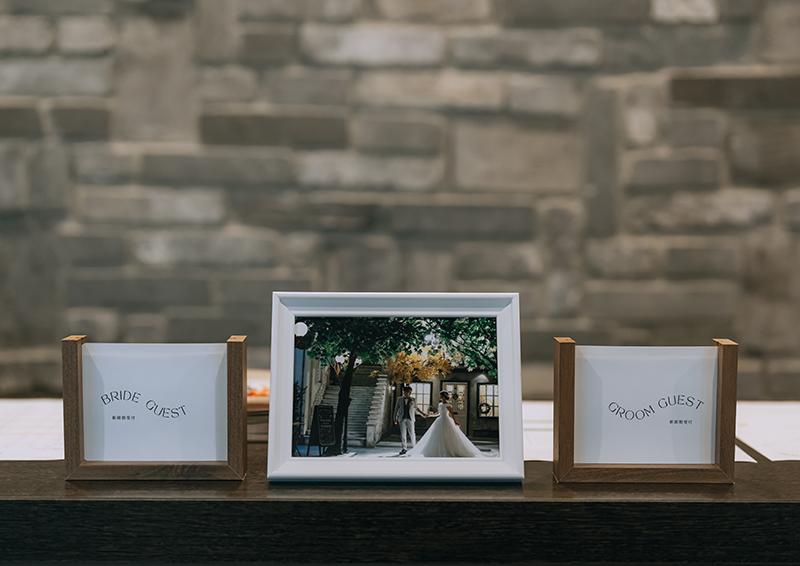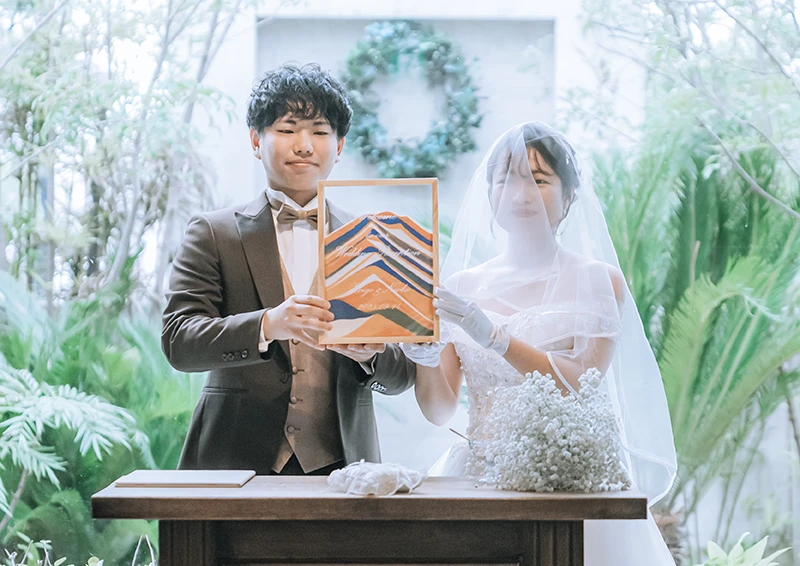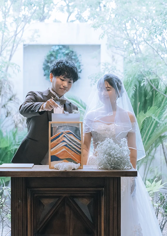 人前式では、「サンドセレモニー」を。 ゲストの皆様に一粒ずつ砂を重ねていただいた証明書は、お二人の誓いの言葉とともに仕上げられました。