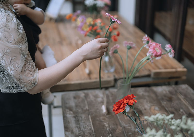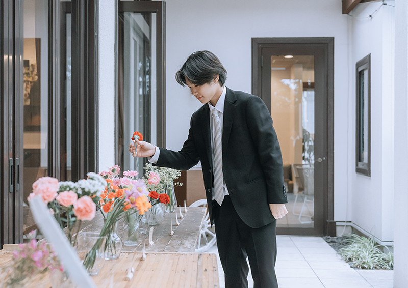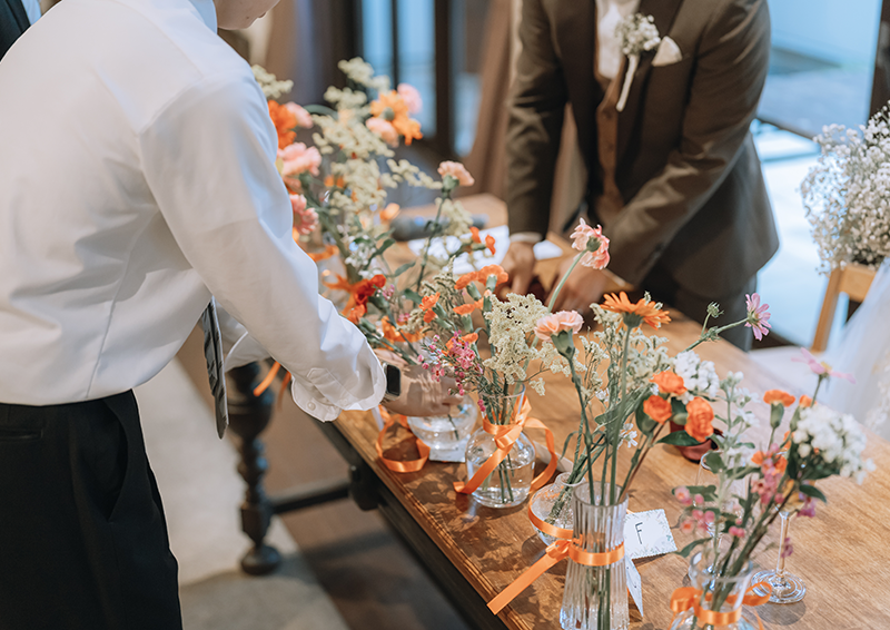 そのままガーデンでは、フラワービュッフェ。ゲスト一人ひとりが花を手に取り、テーブルを彩っていく。