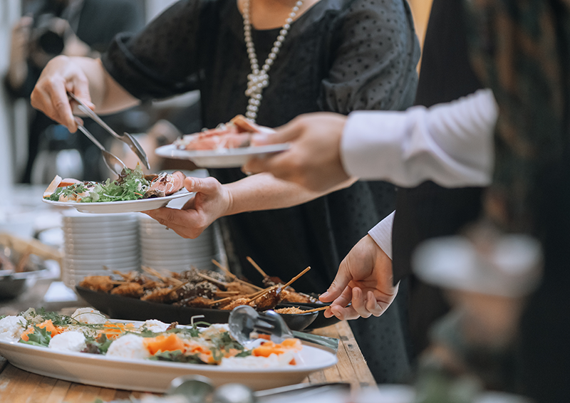 お食事は、名物を取り入れたビュッフェスタイル。それぞれが好きな料理を手に取り、自然と会話が生まれ、テーブルを越えて人と人がつながっていく。