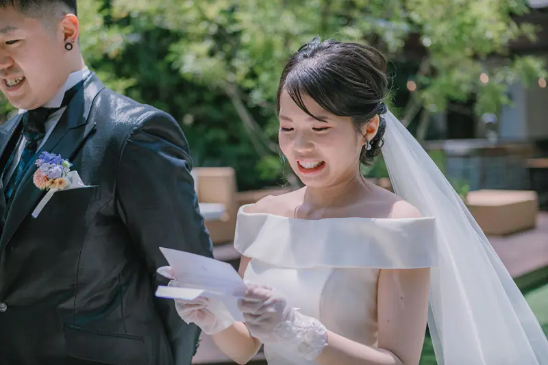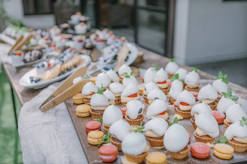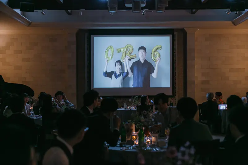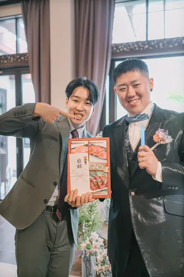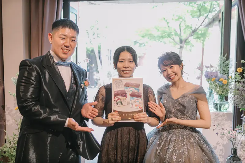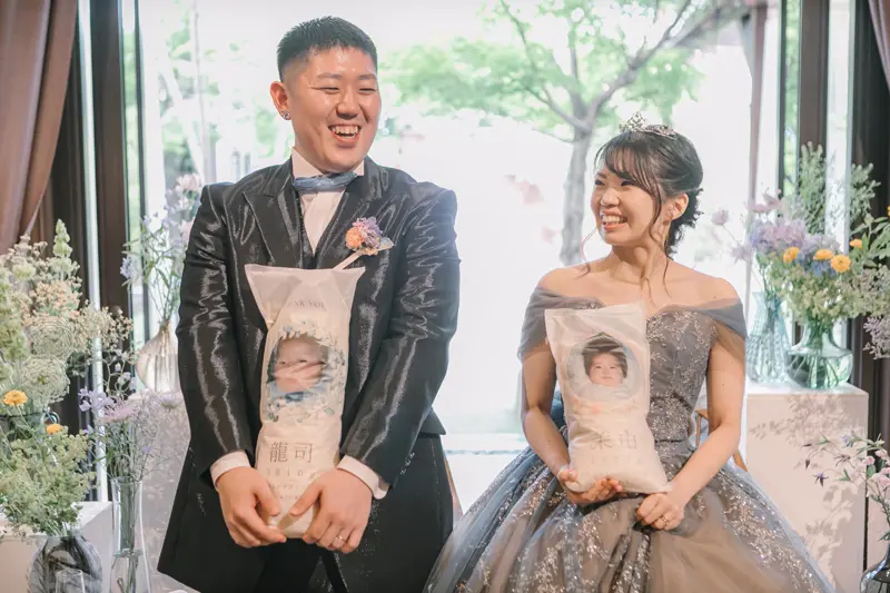再入場後はドレスの色あてクイズの結果発表を。デザートはガーデンにてビュッフェスタイルでお楽しみいただきました。親御様に感謝の気持ちを込めて、生まれた時の体重と同じ重さのお米をプレゼント。感謝の気持ちと共に贈られました。